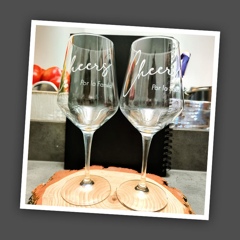 - Engraved wine and champagne glasses or shots with initials, names, or logos.