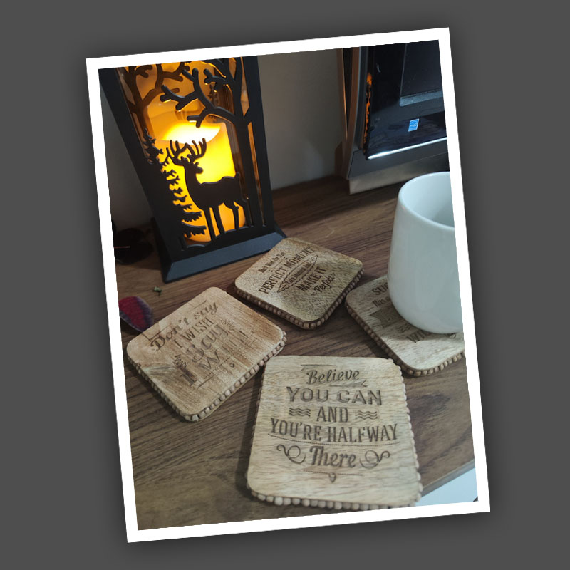 - Coasters in wood, acrylic, or stone, personalized with initials, phrases, or logos.